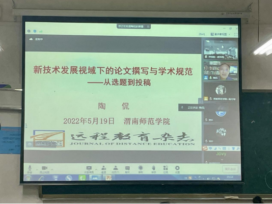 第二场报告于5月19日晚19点在知新楼2216教室召开,学院特邀《远程教育杂志》执行主编陶侃教授作题为“新技术发展视域下的论文撰写与学术规范--从选题到投稿”的报告,学院全体青年教师、大创项目负责人、小学教育专业及考研员工分别以线上、线下形式参与了会议,会议由suncitygroup太阳集团副经理杨方琦主持。