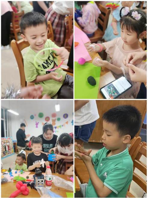 走进十二生肖泡泡屋,有小老师负责引领幼儿认识十二生肖、用泡泡泥制作喜欢的小动物,让他们感受泡泡泥的奥妙;来到欢乐时光游戏堡,有小老师负责引领幼儿用积木堆起五彩城堡、用图画书写真纯祝愿,让他们享受游戏的快乐;进入巧手绘画创意坊,又有小老师负责引领幼儿用画笔画出最美的东西,用巧手制作独特的脸谱,让他们领略创意的独特。