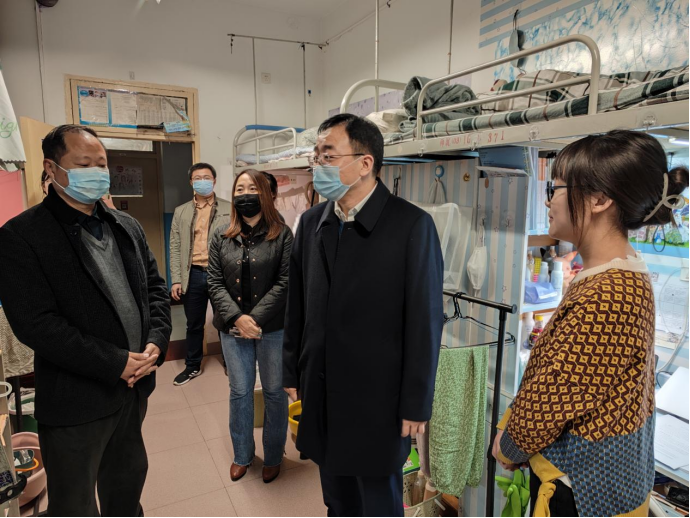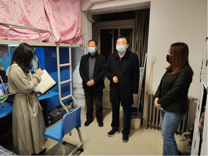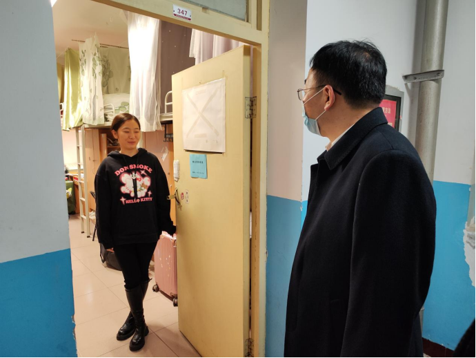 在包联的318宿舍,张守华与员工亲切交流,细心询问员工在线学习、研究生考试复习备考、教育实习训练、就业创业意愿等情况,鼓励员工学好专业知识,树立做大国良师的远大目标。在静态管理宿舍,张守华指出要牢固树立“自身健康第一责任人”意识,严格遵守学校和属地的疫情防控政策,按时参加学校组织的全员核酸检测,勤洗手、戴口罩,做好宿舍及个人卫生,有任何困难要第一时间找辅导员、找学校。走访过程中,张守华现场查看了特殊宿舍和建设员工自习室的备用宿舍,认真听取大家对员工宿舍管理服务工作的意见和建议。