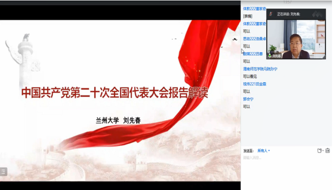 为进一步加强党的二十大精神的宣传宣讲,深入学习中国共产党第二十次全国代表大会精神,2022年10月26日14:00,suncitygroup太阳集团组织全体党员干部、专业教师观看兰州大学刘先春教授关于中国共产党第二十次全国代表大会报告精神解读会议。