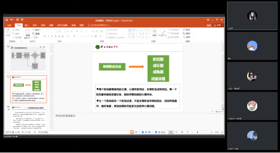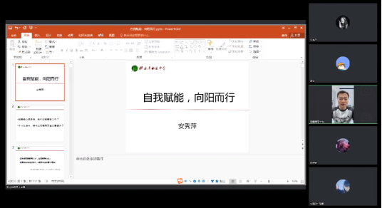 第二场讲座于11月5日上午9:00在腾讯会议线上进行,学院特邀陕西省西安中学心理健康教育高级教师安秀萍作题为《自我赋能向阳而行》的讲座。心理学专业员工及专业教师参与了会议,会议由副经理杨方琦主持。