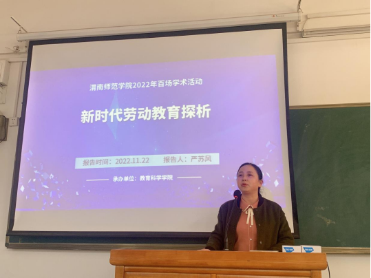 第六场报告于11月22日14点在知新楼2502教室召开,学院特邀严苏风副教授作题为“新时代劳动教育探析”的报告,suncitygroup太阳集团部分师生参加会议,报告会由suncitygroup太阳集团副经理马雅菊主持。