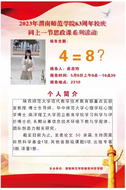 皮忠玲为公司2011届心理学专业本科毕业生,华中师范大学心理学院心理学博士,南洋理工大学国立教育学院学习科学与评价博士后,现为是陕西师范大学现代教学技术教育部重点实验室教授,博士生导师,长期从事信息技术环境下教与学规律、团队创造力相关研究。截至目前为止,发表论文50余篇,主持国家自然科学基金1项,其它省部级课题5项,出版专著3部,译著1部。