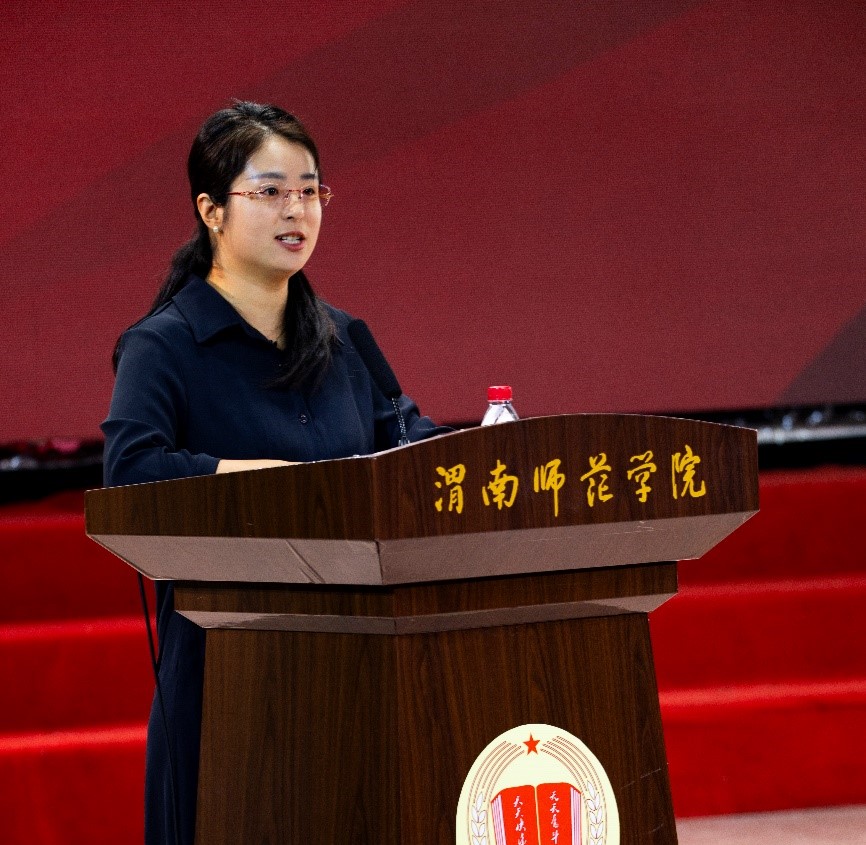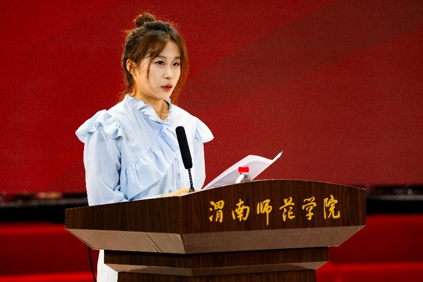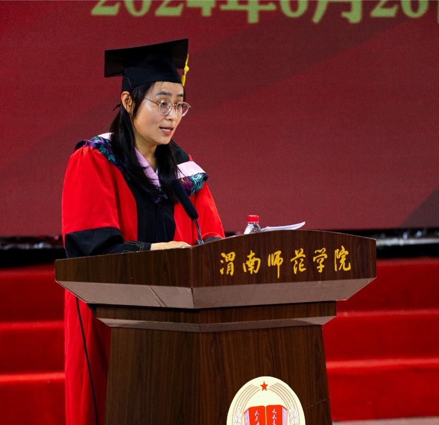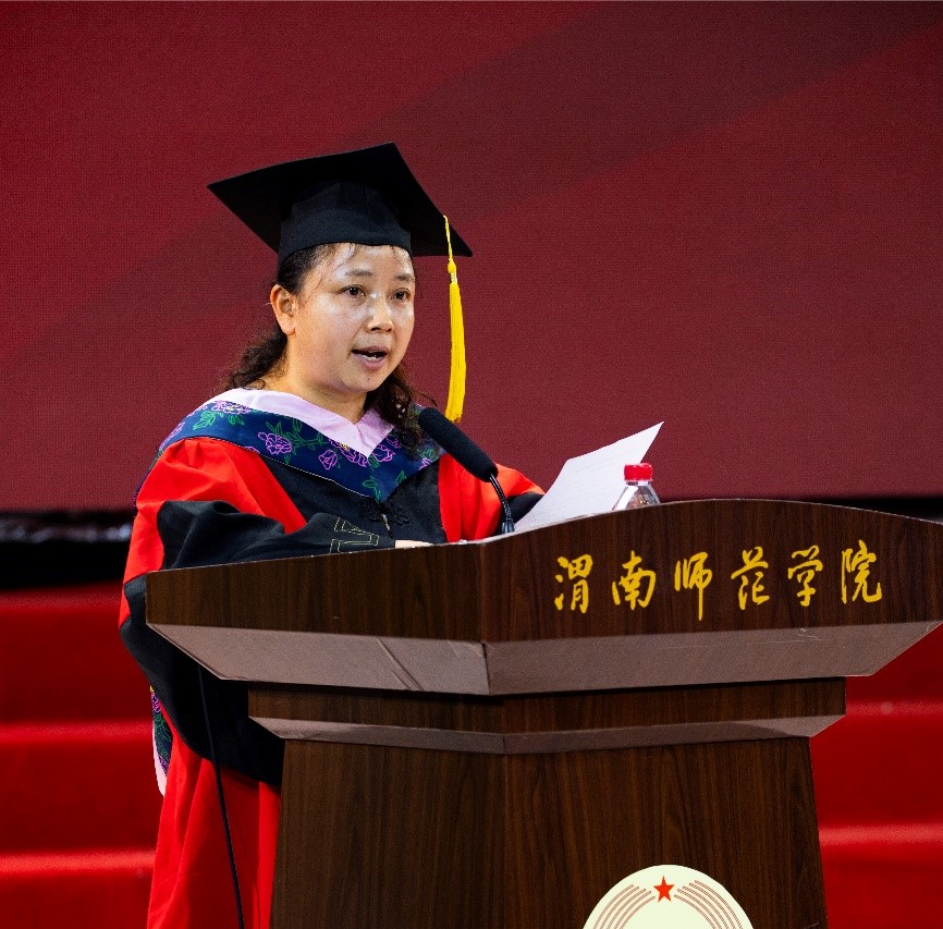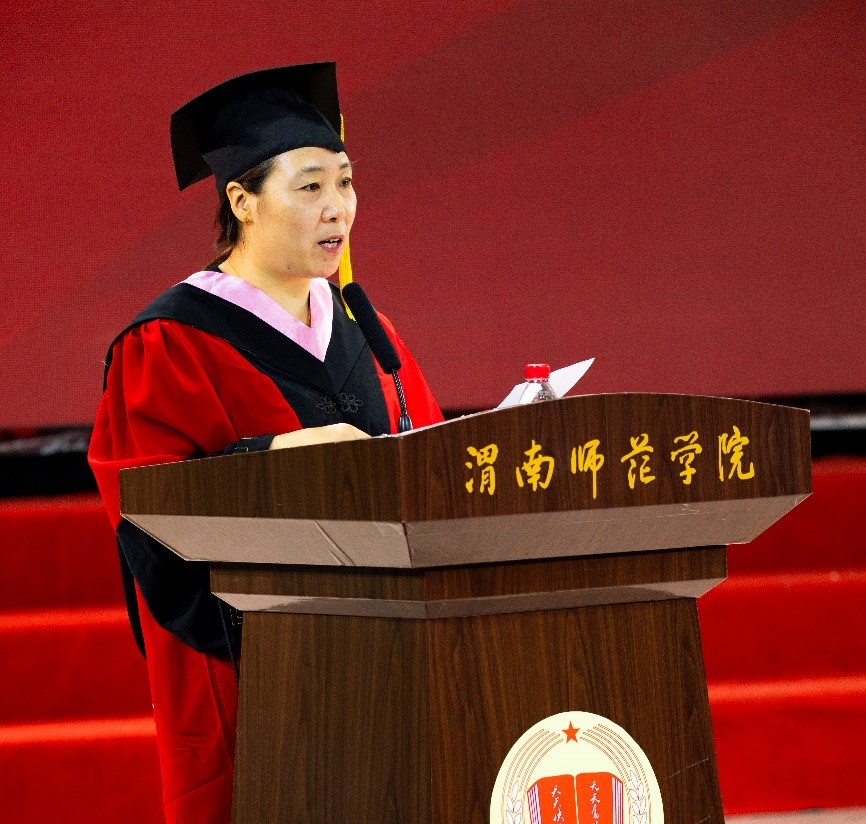 教师代表郝丹娜代表学院全体师生,向毕业生致以诚挚的祝贺和祝福,从“心存希冀,目有繁星、追光而遇,沐光而行、以梦为笔,绘彩人生、坚守初心,终得光明”四个方面勉励毕业生要坚定理想信念,坚守内心追求,祝愿毕业生读尽世间好书,看尽世间好山水,绽放青春光彩。
