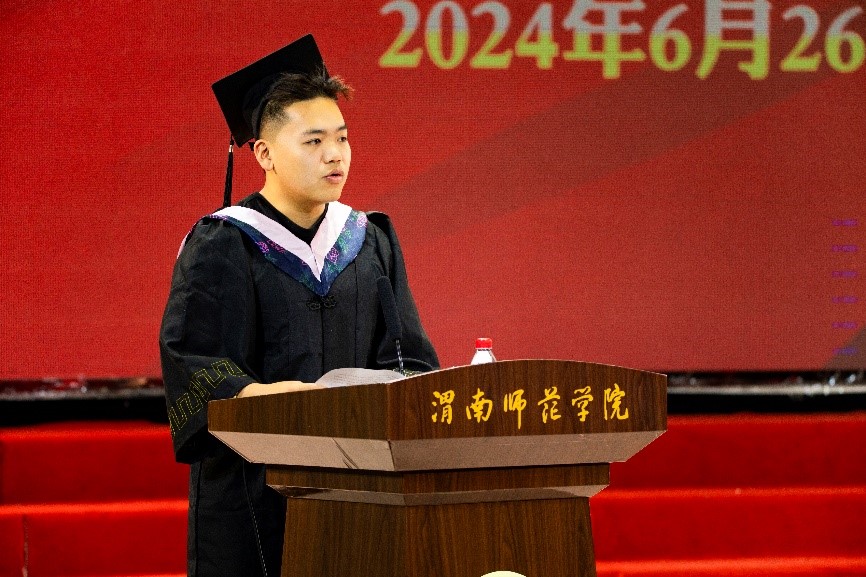毕业生代表朱俊臣感谢学院以最隆重的仪式感为毕业生送上难以忘怀的毕业典礼,向学院领导及老师致以最诚挚的谢意,向圆满毕业的同学们表示祝贺,寄语学弟学妹们要心存理想,志存高远。在校生代表张美玉向即将毕业的学长学姐们致以最美好的祝愿,祝愿他们带着知识给予的底气和智慧,带着实践给予的理想与未来,昂首阔步,踏上新的征程。