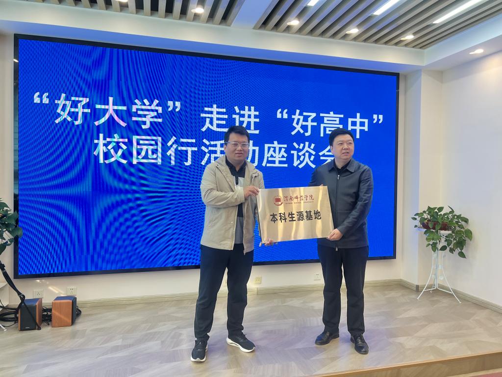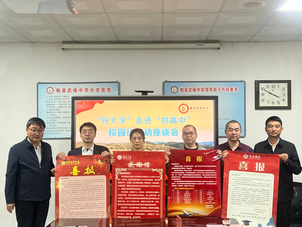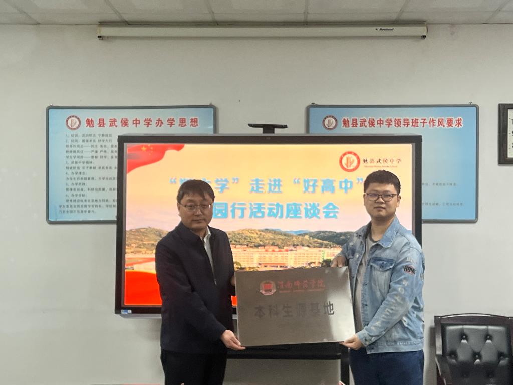 在勉县武侯中学,祝君年董事长代表学校对各高校的到来表示热烈欢迎,并介绍了学校的办学理念、发展历史、教学质量及办学成果等情况。随后,太阳集团向武侯中学授优质生源基地牌并赠送录取喜报,并做了现场招生宣传。