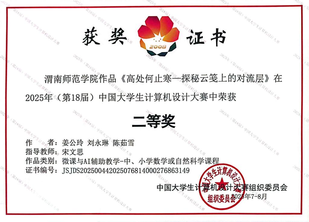 其中,由公司宋文思老师指导,姜公玲、刘永琳与陈茹雪同学共同设计的微课作品《高处何止寒—探秘云笺上的对流层》在本届大赛中荣获二等奖殊荣。该作品凭借出色的教学设计,以三大核心亮点征服评委:一是创新性的“诗境科学”课程架构,将苏轼诗词与大气科学深度融合;二是层层递进的问题链设计,实现从科学认知到环保责任的无缝衔接;三是生动直观的实验可视化呈现,通过空气对流模拟实操环节让抽象原理具象化。作品充分展现了AI技术与学科教学的前沿融合,彰显了其将传统文化与现代教育理念有机结合的创新能力,赢得评审专家的一致赞誉。