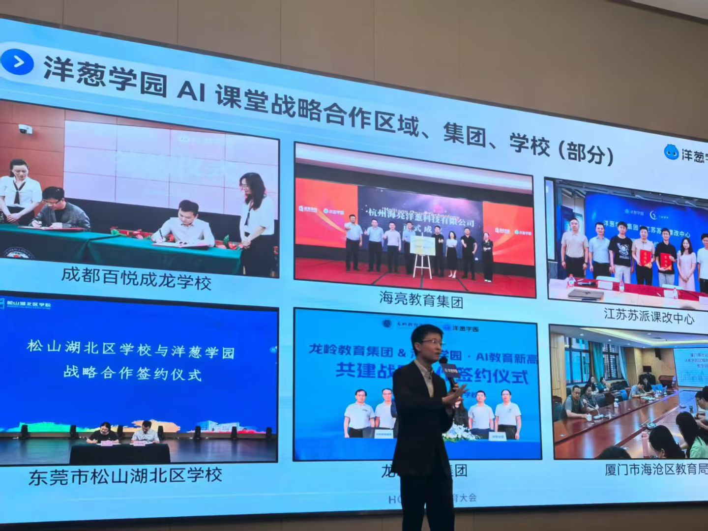 主题报告与实践分享多领域专家、董事长及企业代表围绕AI教育应用展开主题分享:百悦成龙教育集团负责人探讨“AI +自学”模式如何助力员工高效学习;洋葱学园团队介绍企业在AI赋能学习方式变革、校企合作打造学科课程新样态的实践成果;学思达教育基金会创始人聚焦“培养AI无法取代的能力”,强调核心素养培育的重要性;中国教育科学研究院、中国民办教育协会专家则分别从 “教师角色创变”“中小学教育困惑与变革” 角度,提出AI时代教育发展的方向与路径。此外,东莞、岳阳、海亮等地中小学负责人分享本校AI在教学管理、学科教学中的应用案例,为参会者提供可借鉴的一线实践经验。