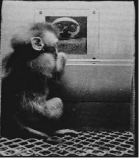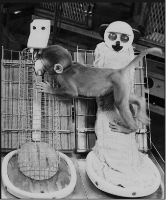 哈洛又将“绒布妈妈” 移到另一间房间,然后用发条玩具继续恐吓。小猴更加害怕了,但即使再害怕,它也不奔向 “铁丝妈妈”,而是眼巴巴地望着另一边的 “绒布妈妈”。